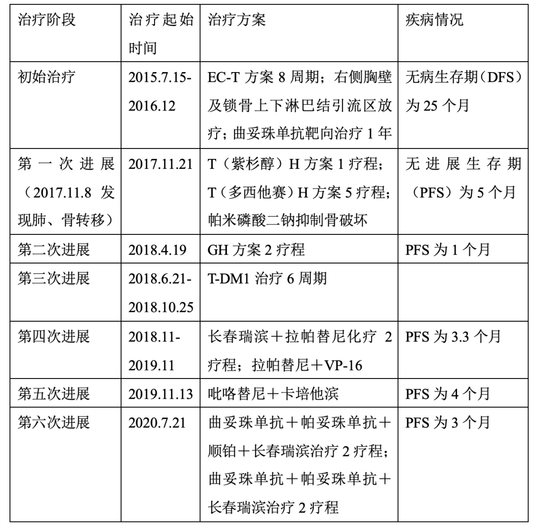 初诊情况:绝经后女性,6年前因“乳腺癌”行右乳腺癌改良根治术,术后病理:(右侧乳腺)浸润性导管癌III级,肿块大小3.5 cm*3 cm*2.5 cm,乳头及各象限未见癌,乳腺旁淋巴结见转移癌(6/15)。免疫组化:ER(-)、PR(-)、HER2(3+)、Ki67(+60%)。术后诊断为右侧乳腺浸润性导管癌IV期。患者经6线治疗且使用过拉帕替尼、T-DM1等药物,现在无有效的治疗方案。