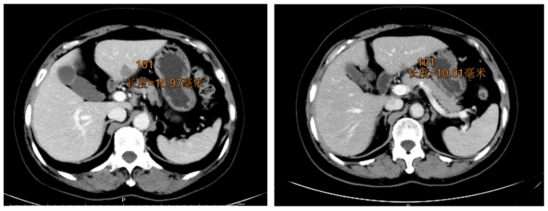 综合评估患者,ECOG评分为1分,具有符合RECIST v1.1定义的可测量病灶,并符合所有入组标准,于2021.4.20签署知情同意书,2021.5.10入组接受MRG002治疗。患者基线期多发转移(肺转移、肝转移),2021.6.21治疗第2周期时进行了第1次影像学评估,发现肝转移灶由15.97 mm缩小至10.01 mm(图1)。评估为PR。同时患者治疗期间耐受性好,不良反应多为1级。