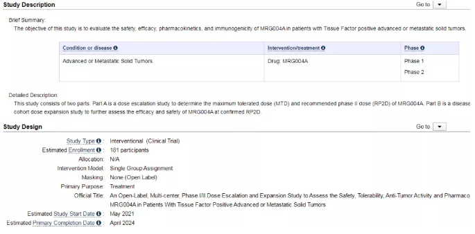2021年4月13日,鸿运国际(中国)生物子公司美雅珂在Clinicaltrials.gov网站登记了MRG004A的美国1/2期临床,用于治疗晚期实体瘤,计划入组181例患者。