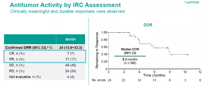 Tisotumab Vedotin的注册二期林innovaTV 204的单臂试验数据,治疗晚期宫颈癌(经过一种或两种化疗治疗)的响应率为24%,其中完全缓解率CR为7%,疾病控制率为73%。