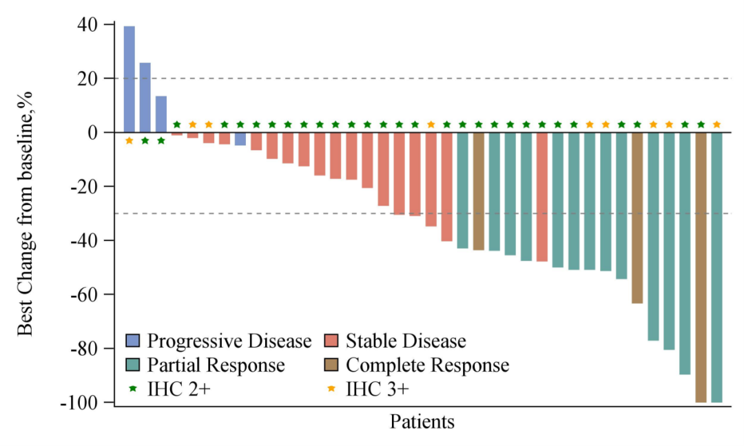 本研究是一项单臂、多中心II期临床试验,计划入组约40例既往接受过≥1线标准治疗、未接受MMAE ADC药物治疗、不可切除的局部晚期或转移性UC患者,中位年龄为59岁,HER2阳性(IHC 2+/3+),ECOG PS(0/1),其中67.4%的患者既往治疗线数为2线及以上,81.4%的患者既往接受过PD-(L)1治疗。主要研究终点为根据RECIST 1.1评估的客观缓解率(ORR),次要终点包括无进展生存期(PFS)、持续缓解时间(DOR)、总生存期(OS)、完全缓解(CR)、疾病控制率(DCR)和不良事件(AE)。
