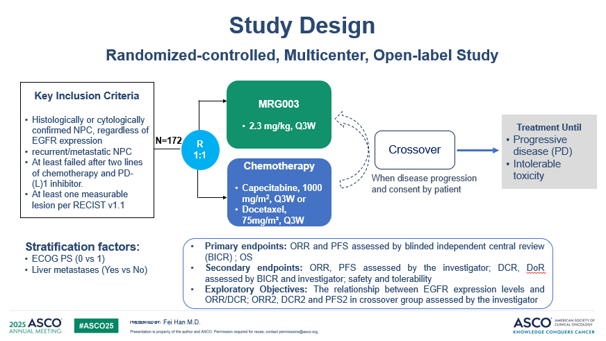 医脉通:近期,您领衔召开的EGFR ADC新药Becotatug Vedotin(MRG003)用于治疗晚期鼻咽癌的随机对照临床研究以LBA口头报告形式,在2025 ASCO年会上首次报告结果。作为主要研究者,能否请您介绍一下研究召开的背景和具体研究设计?