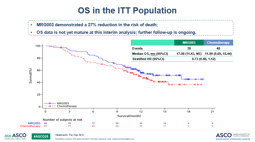 截至2024年12月30日,期中分析时两组患者的中位OS分别为17.08个月vs. 11.99个月(HR=0.73),Becotatug Vedotin已显示出明确的获益趋势。排除交叉治疗的影响后,两组的OS HR为0.59(95%CI 0.37-0.93),生存获益更加明显。在安全性方面,Becotatug Vedotin组与化疗组的治疗相关不良事件(TRAE)发生率相似,大部分的不良反应为1~2级,≥3级TRAE发生率分别为45.3%和50.6%,不良反应可控可管理[5]。